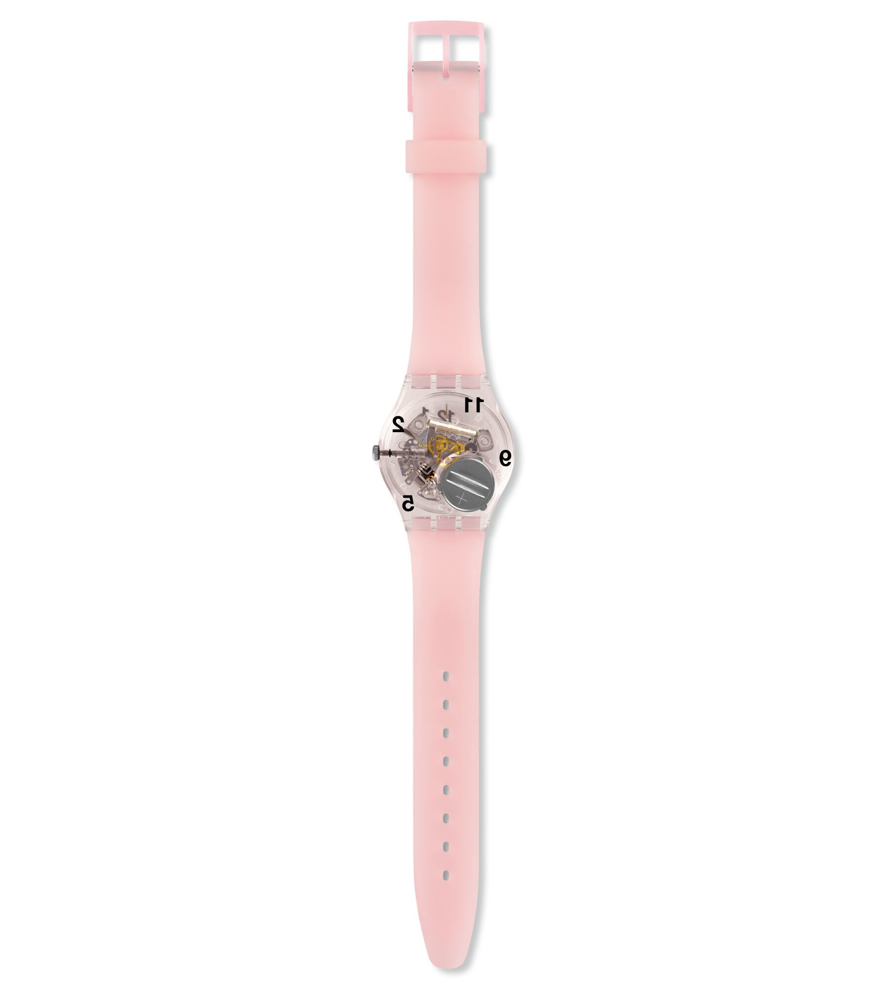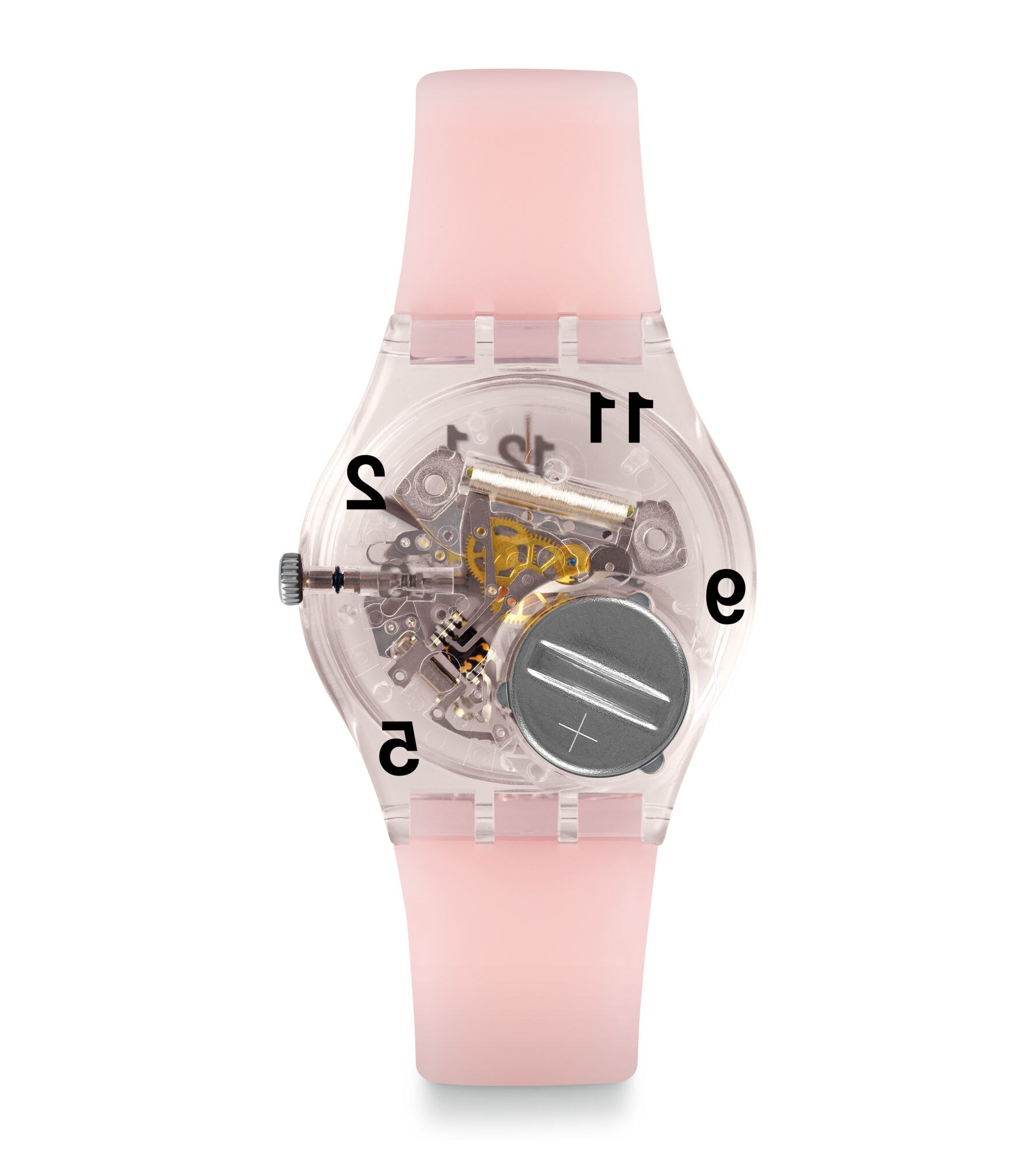 Swatch goes 3D with PINK BOARD (GP158)! The numerals on the innovative dial pop with a dynamic layered style made possible by printing the numbers on the dial and glass; and the ones printed on the caseback are also visible from the top.