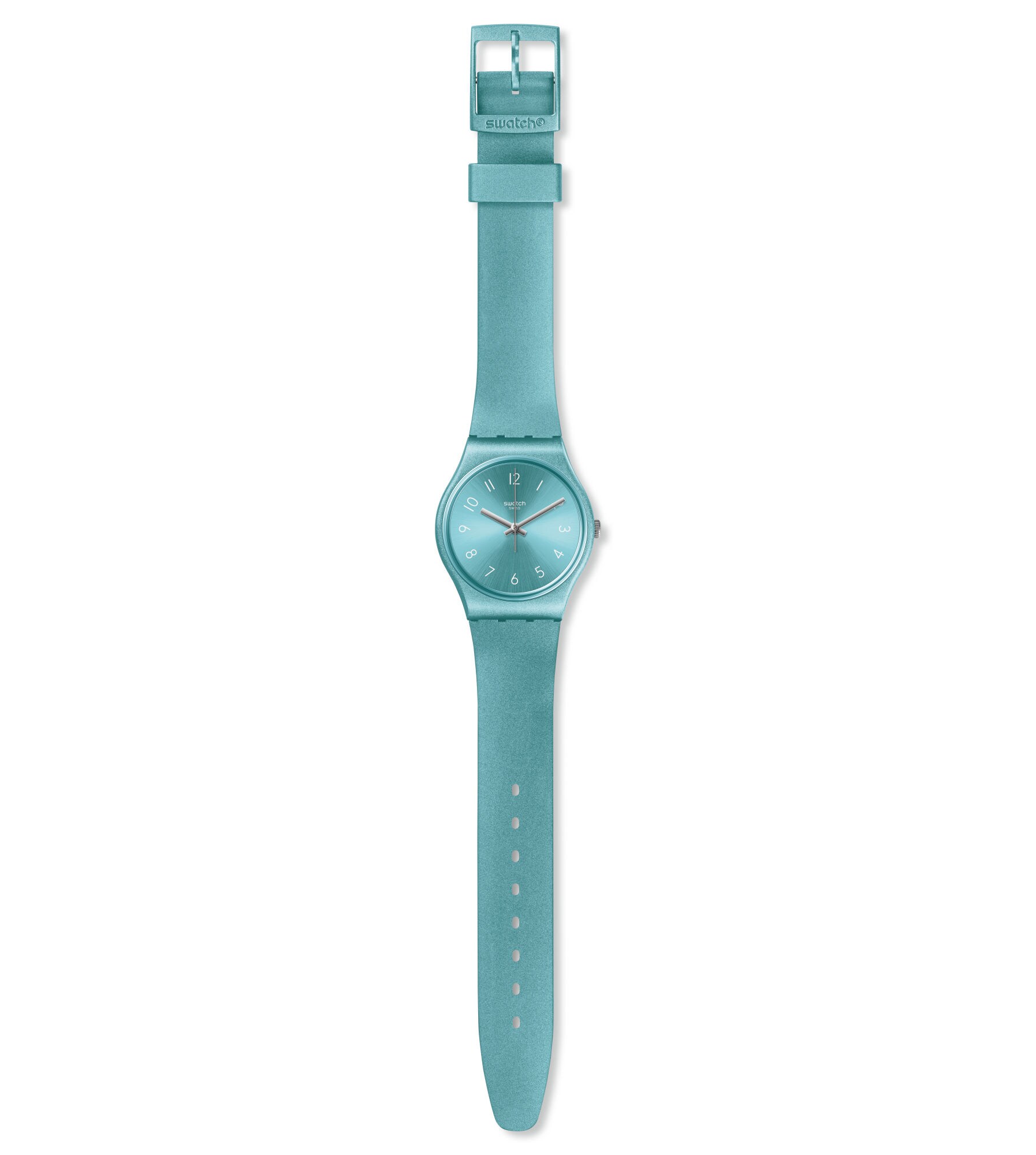 SO BLUE (GS160) cheers you up with a shiny, shimmering metallic effect gleaming on the plastic strap. The sun-brushed blue dial reflects this same design feature.