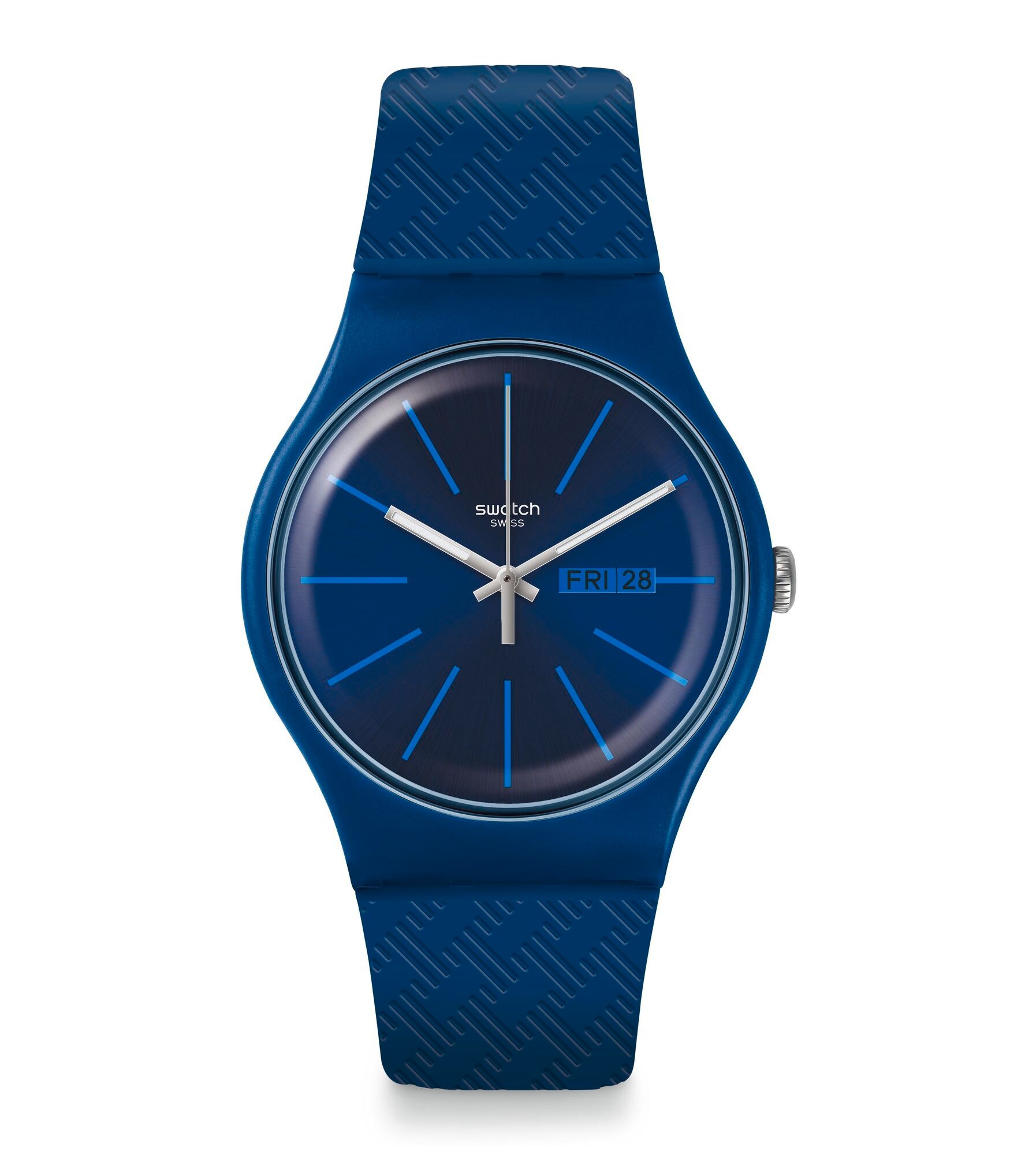WAVE PATH (SUON713) crashes on shore with a deep blue textured strap and a shiny sun-brushed blue dial with touches of light blue.