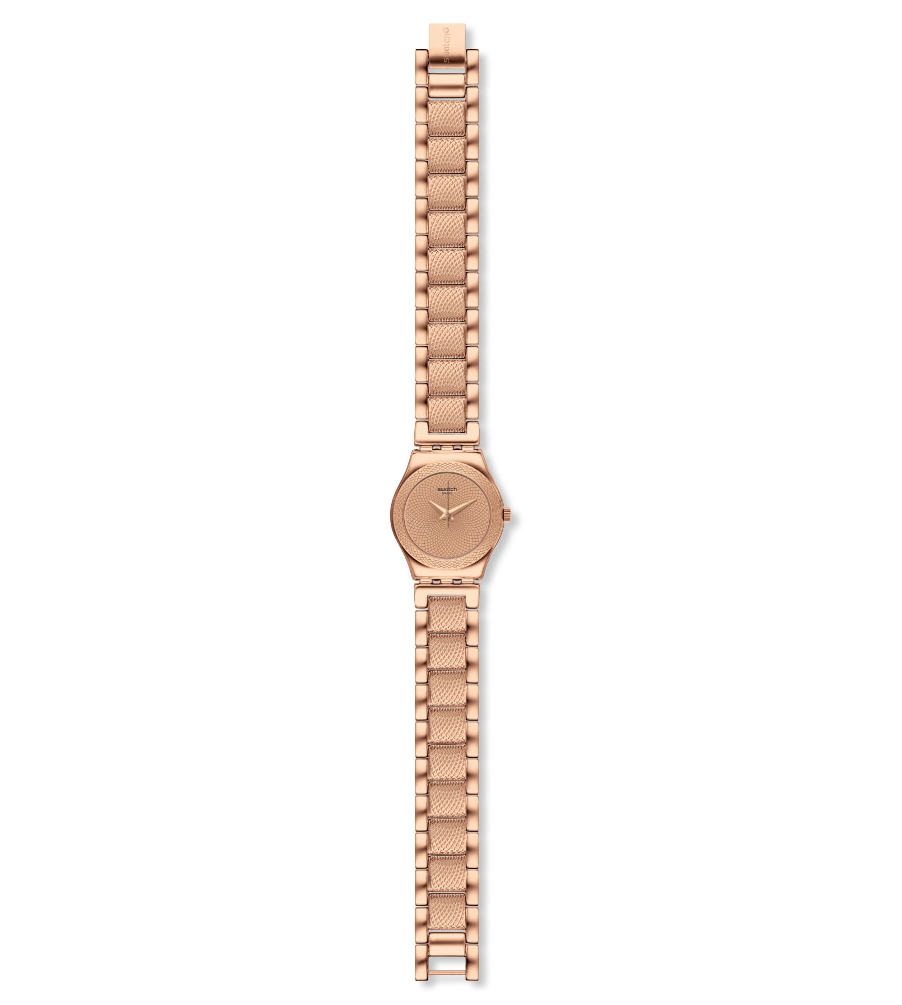 FULL ROSE (YSG163G) goes all the way with a glittering dial with rose-gold-colored Swatch Appliques. The middle links of the rose-gold-colored bracelet and the bezel are engraved with a textured pattern that resembles glitter.