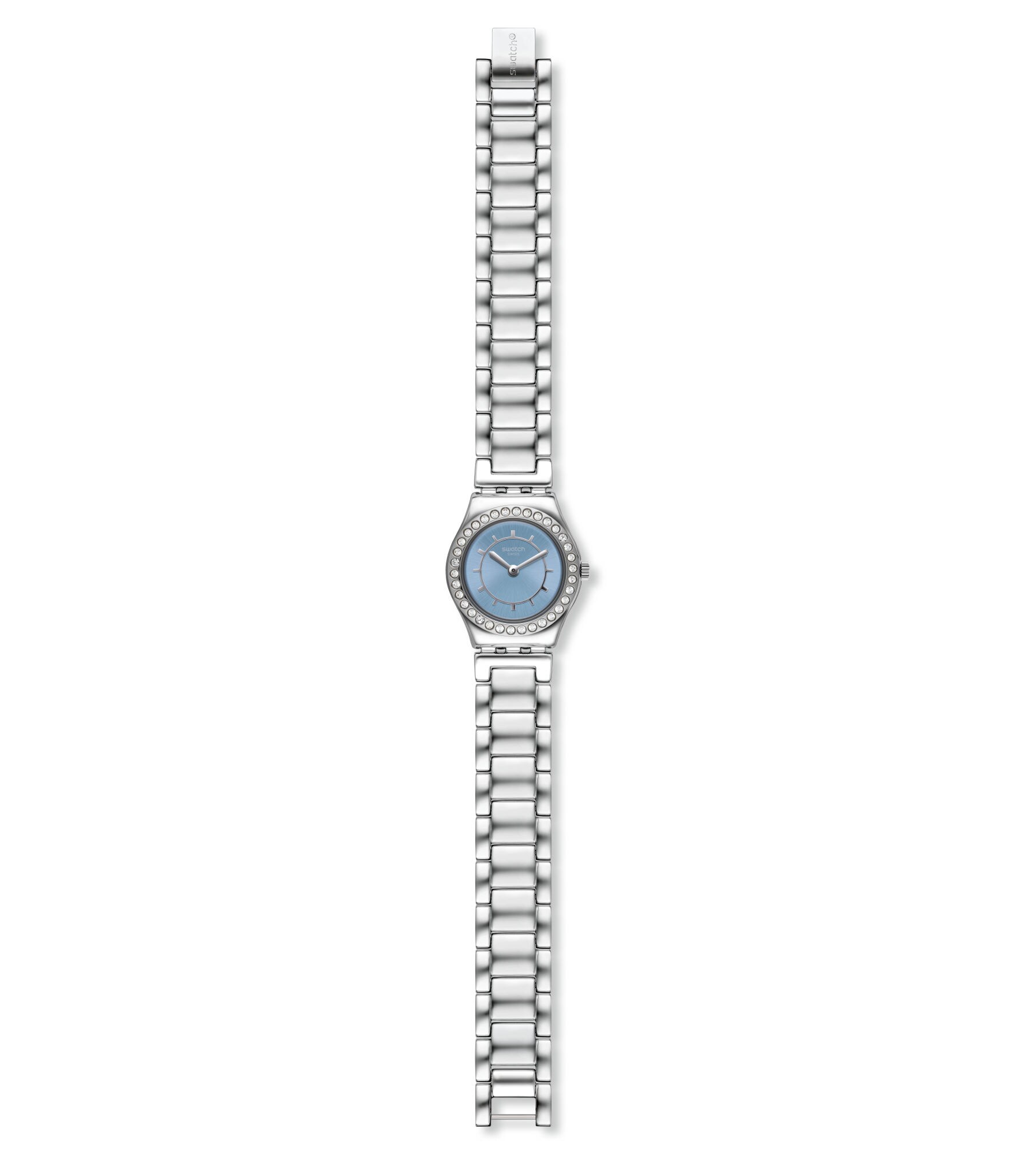 In a league all her own, LADYCLASS (YSS329G) has a low-key light blue dial whose sun-brushed effect glimmers like the clear crystals around the bezel. Silver-colored Swatch Appliques adorn the dial.