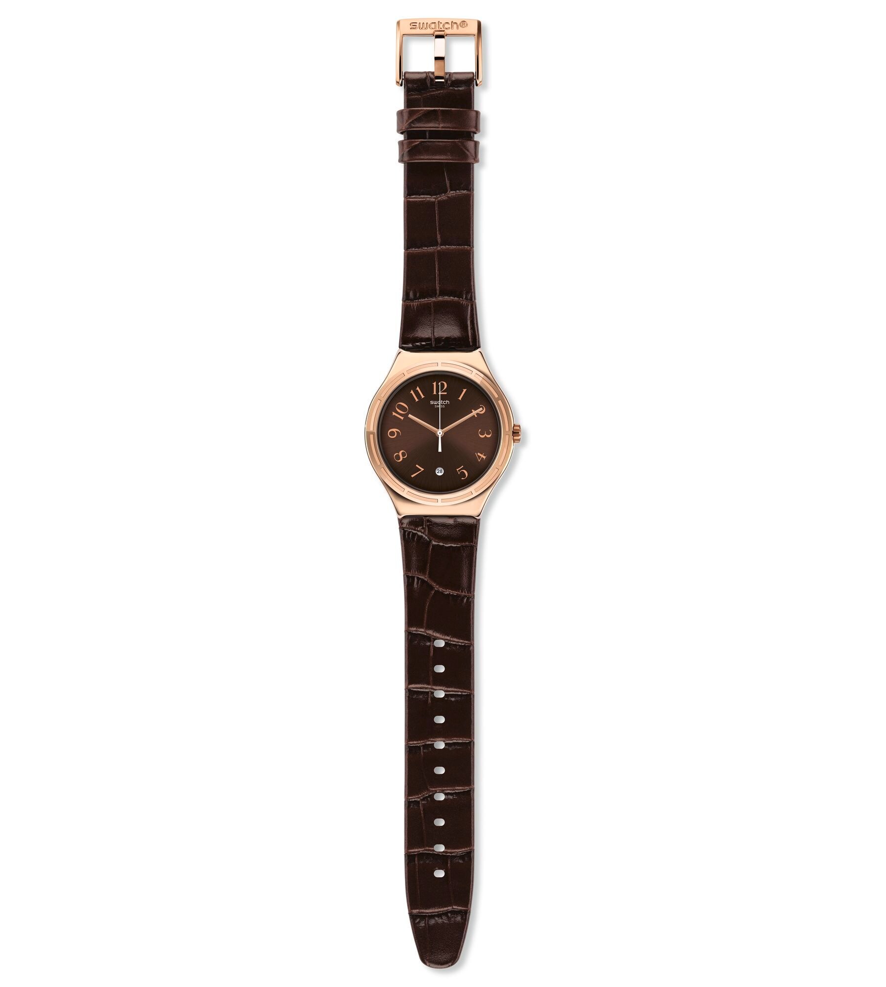 En un equilibrio armonioso entre elegancia y estilo moderno, la mejor tarjeta de presentación del HARMONIEUSE (YWG406) es su lujosa caja de PVD rosa dorado y su esfera marrón oscuro con impresiones en dorado.
