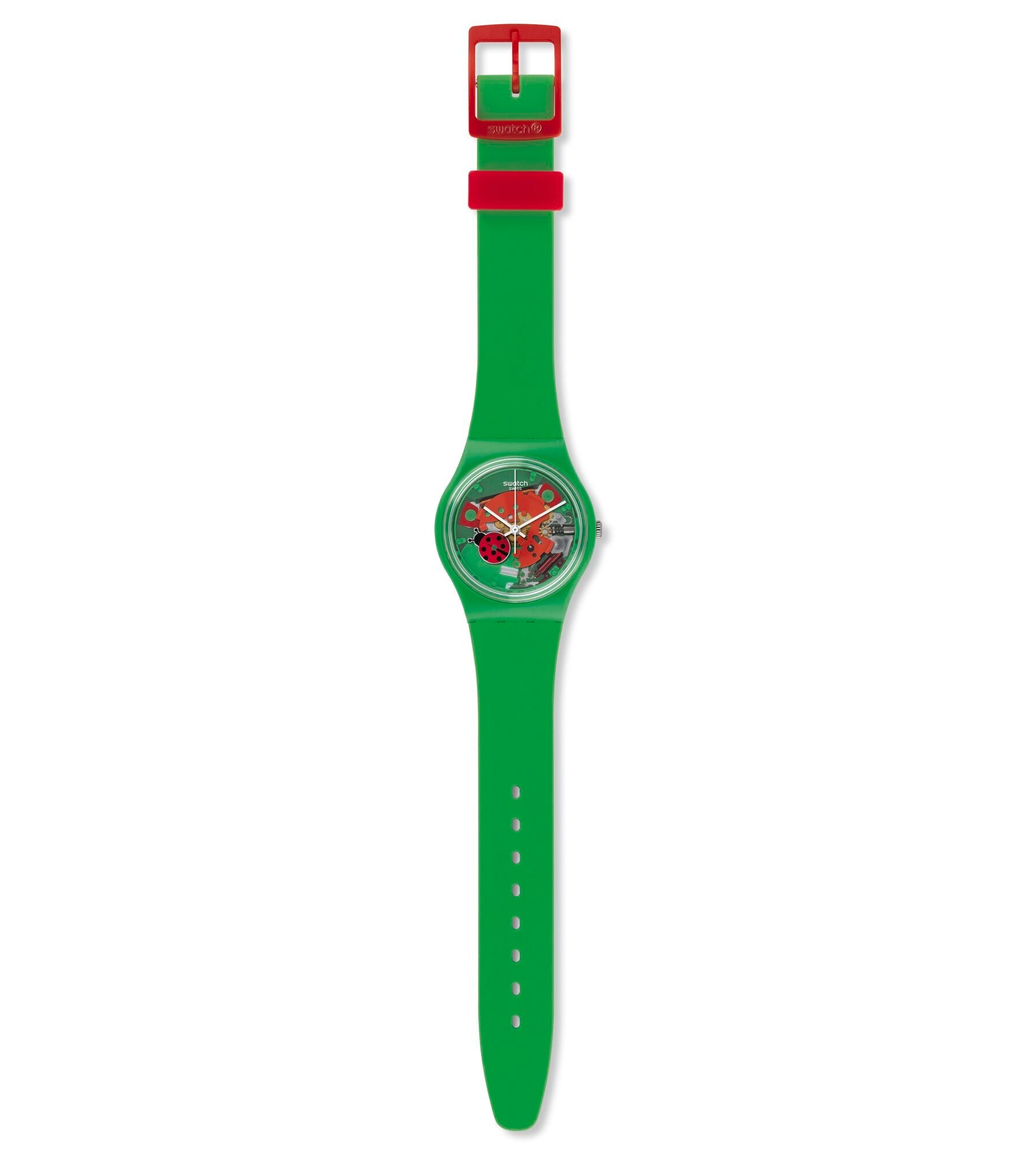 Un estilo perfecto para primavera y verano; el atractivo reloj CHOUPETTE (GG220) destaca por su divertida esfera que deja entrever el mecanismo rojo e incluso un engranaje con forma de mariquita. La caja y la correa destacan por su espectacular verde con el toque de contraste que aportan la trabilla y la hebilla en rojo.
