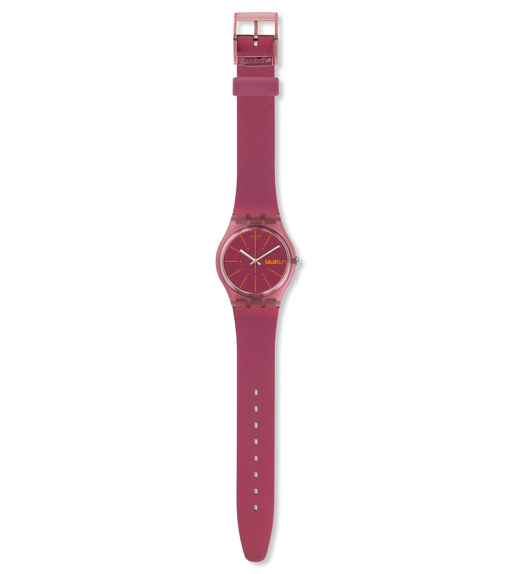 El SNEAKY PEAKY (GP701) atrae todas las miradas con su inconfundible color rosa chicle, una esfera iridiscente y una ventana de fecha naranja. Color en estado puro para un reloj resplandeciente: este Swatch presenta agujas naranjas en el interior de una caja transparente y mate. La correa de silicona sigue el mismo tema rosa con trabilla y hebilla en tono rosa contrastado.