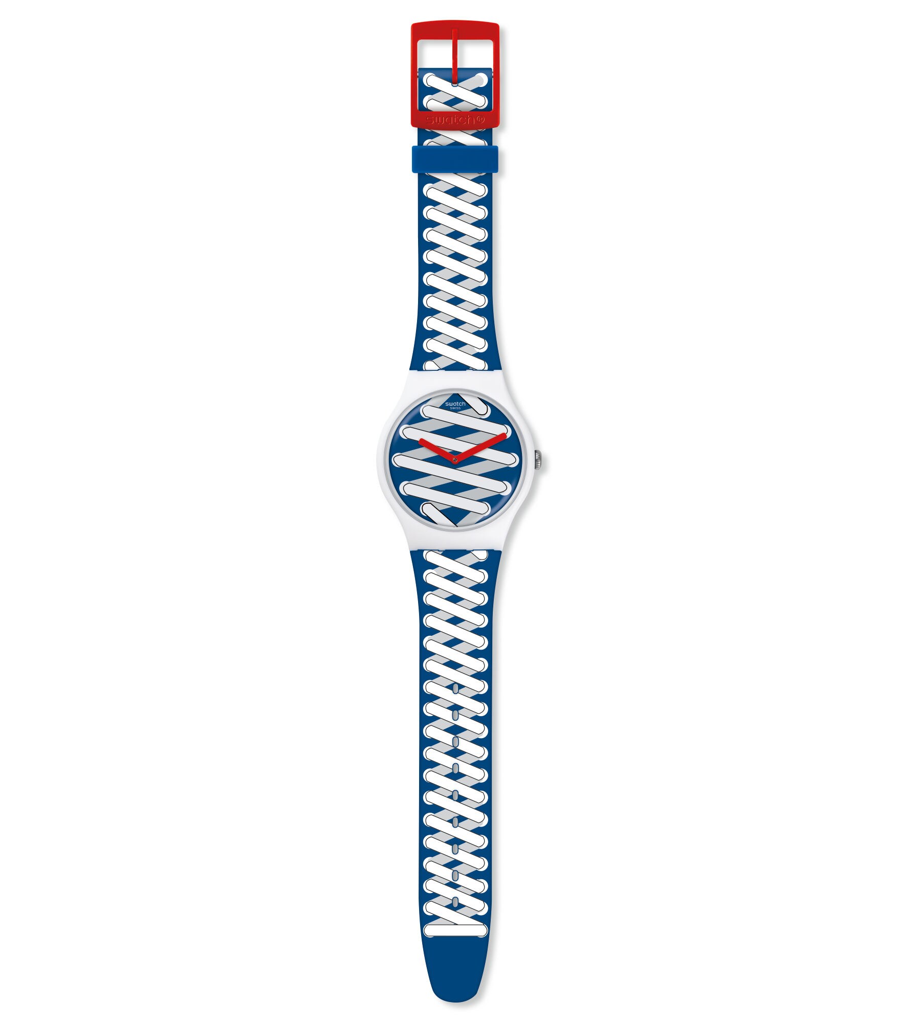 Abróchate tus deportivas favoritas con este diseño inspirado en unas zapatillas de loneta. La esfera azul con cordones impresos viene enmarcada por una caja de plástico blanco mate. La correa de silicona azul mate prolonga el diseño con unos cordones impresos de extremo a extremo. La trabilla azul de silicona y la hebilla de plástico rojo mate completan el diseño deportivo.