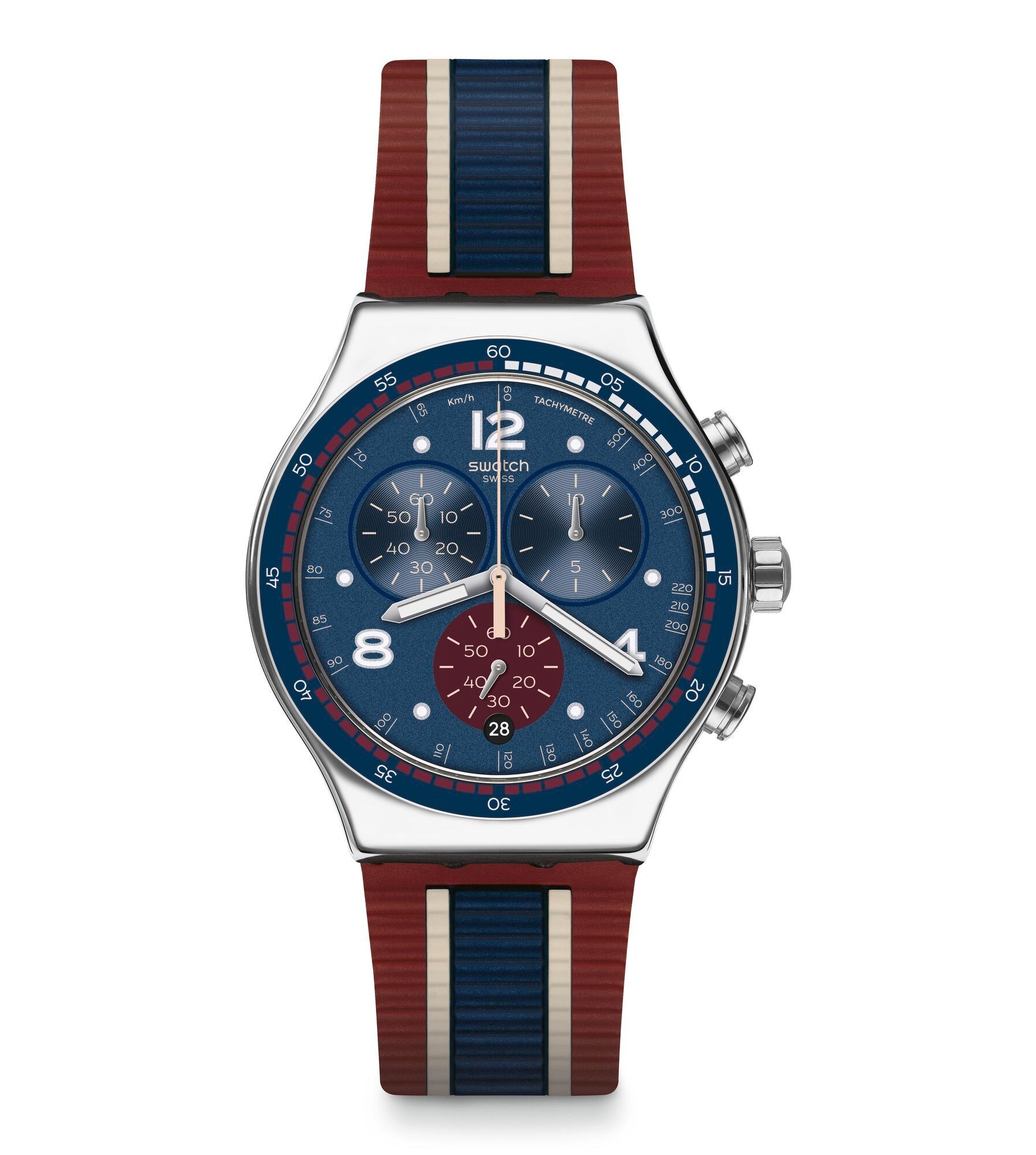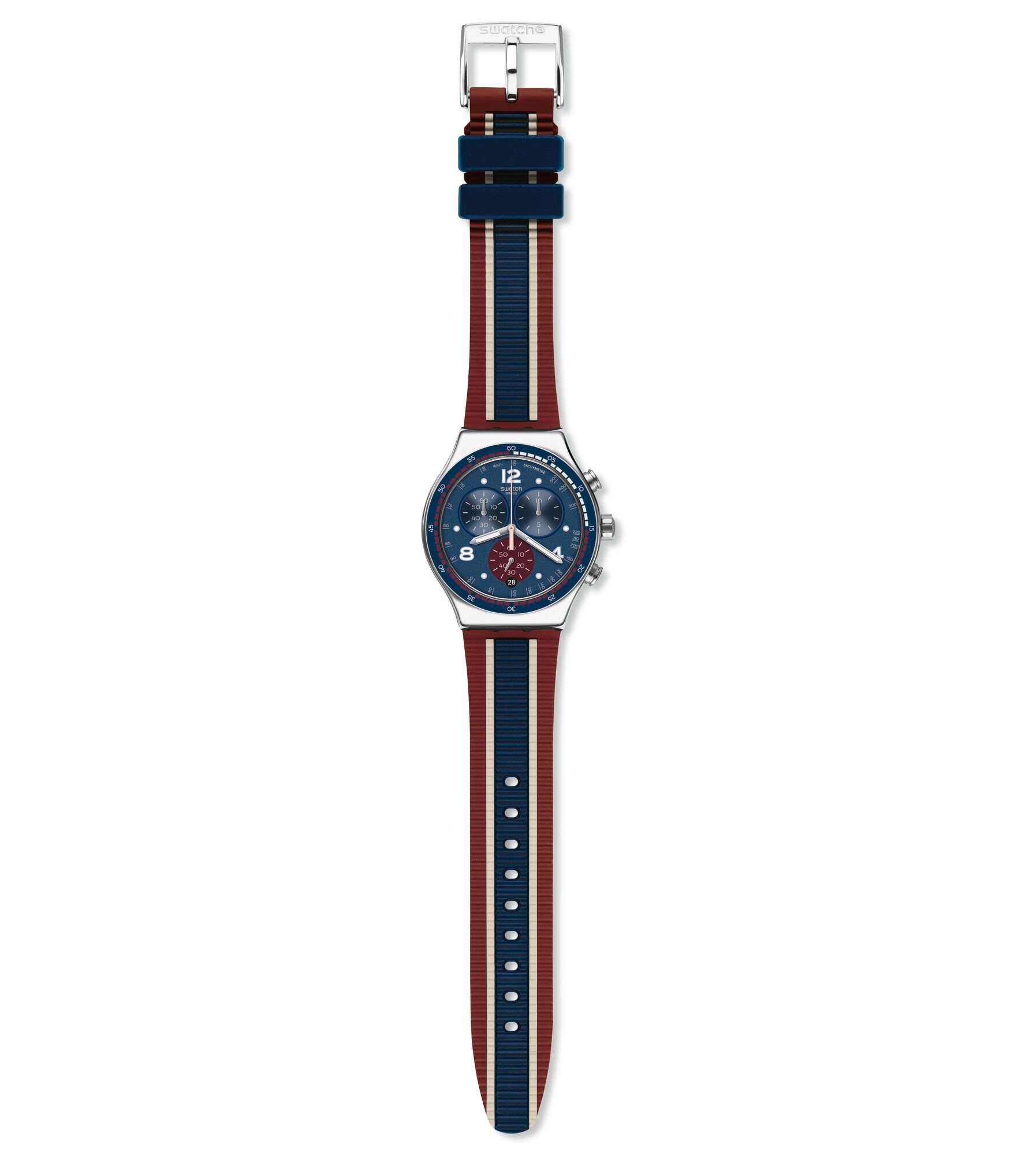 La COLLEGE TIME, avec son style BCBG, obtient les meilleures notes en style, en fonction et en design. Son bracelet en caoutchouc structuré arbore des rayures bleu marine, marron et grises.