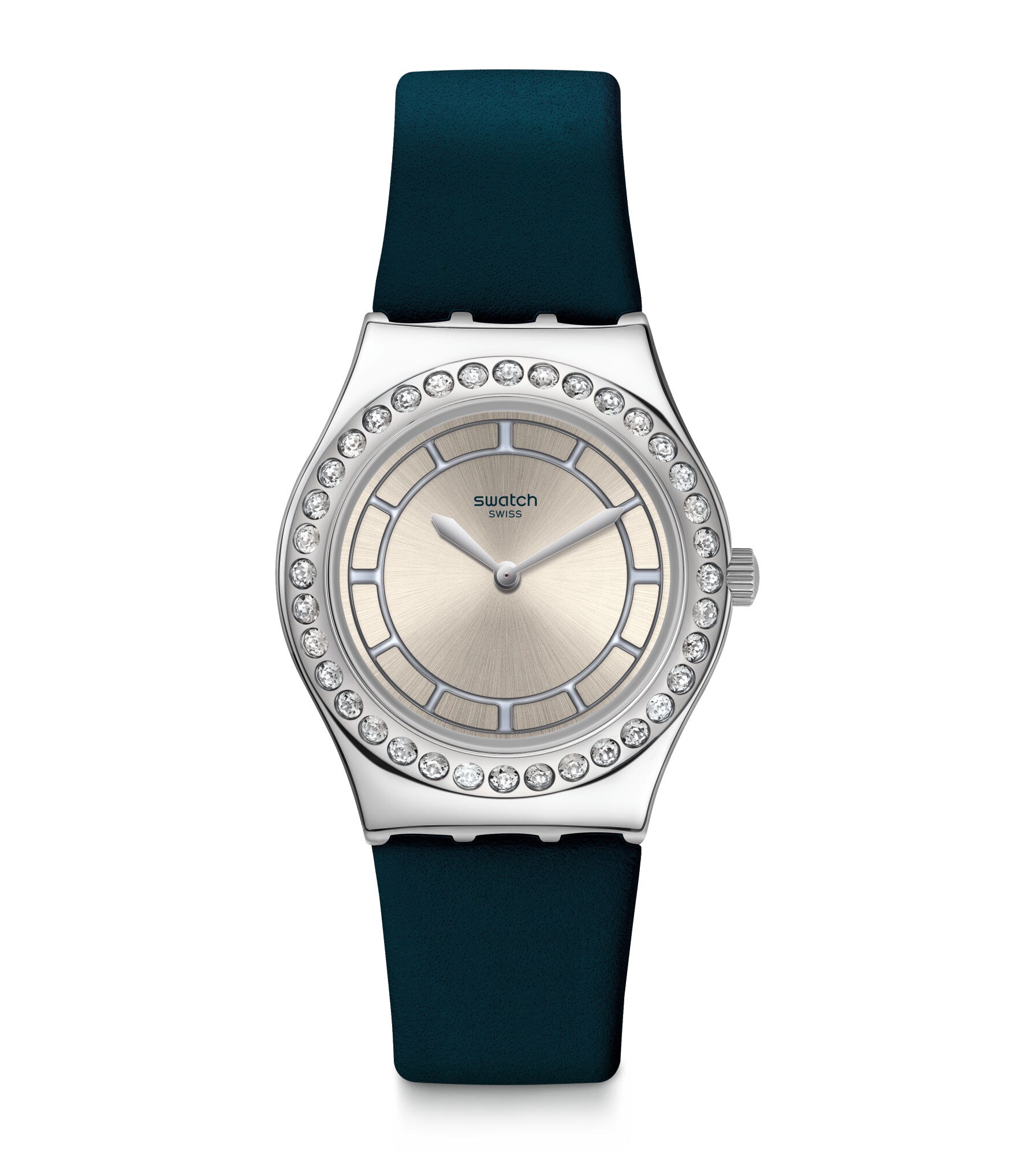 Utsøkte BLUECHIC (YLS211) har en moderne mørkeblå lærreim, den solbørstede sølvfargede urskiven er dekorert med Swatch Appliques mens kassen glitrer med klare krystaller.