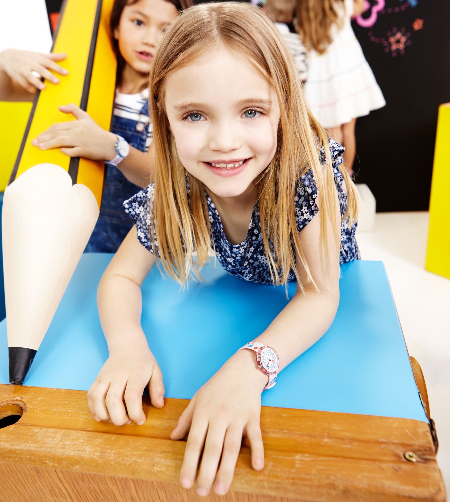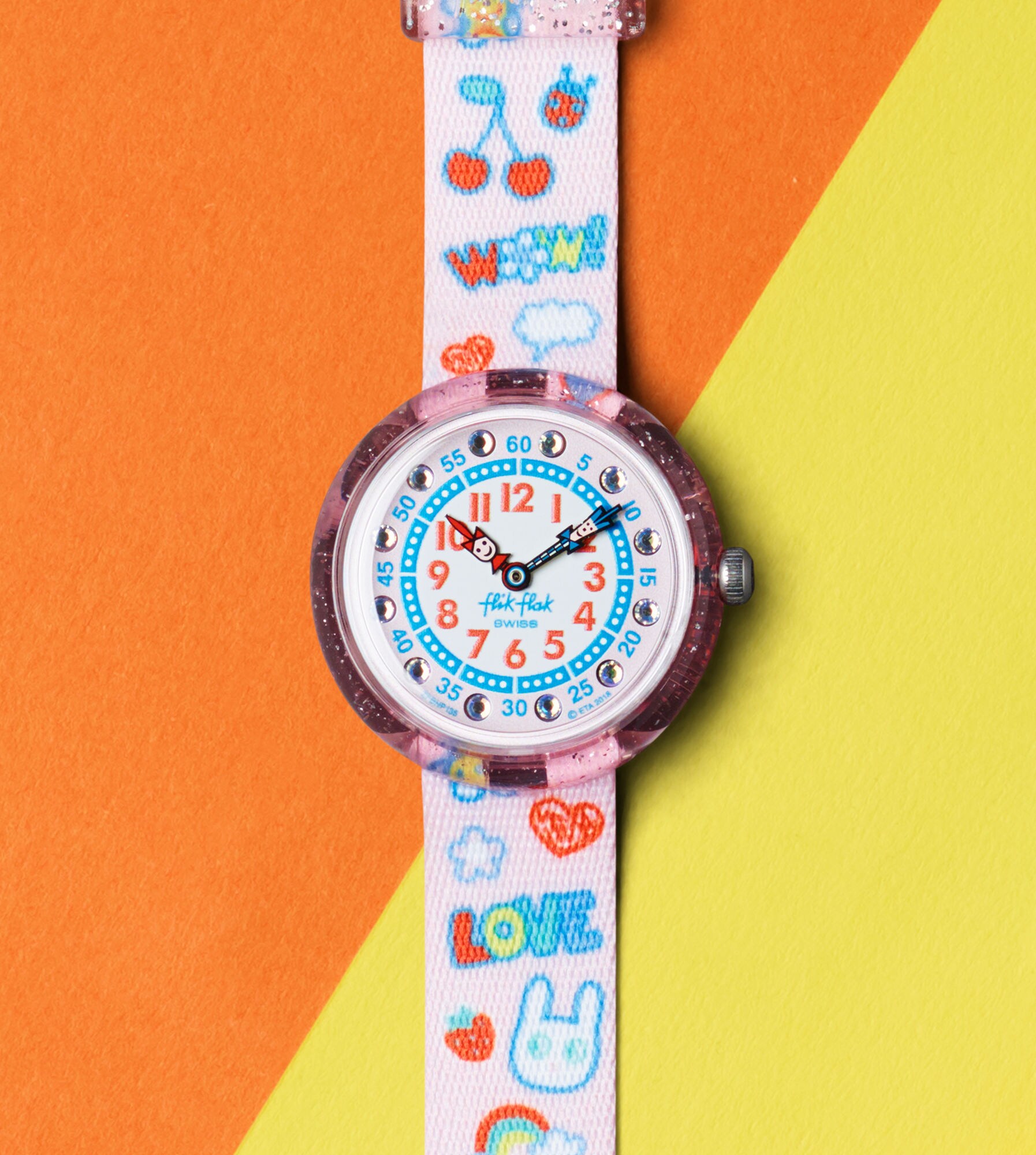 Aprender na escola ficou ainda mais divertido graças ao WOW LOVE. Extravagante e animado, com unicórnios brilhantes que mostram o caminho, este relógio de fabrico suíço tem um mostrador com impressão digital e pedras preciosas, que combina com uma caixa em plástico rosa brilhante.