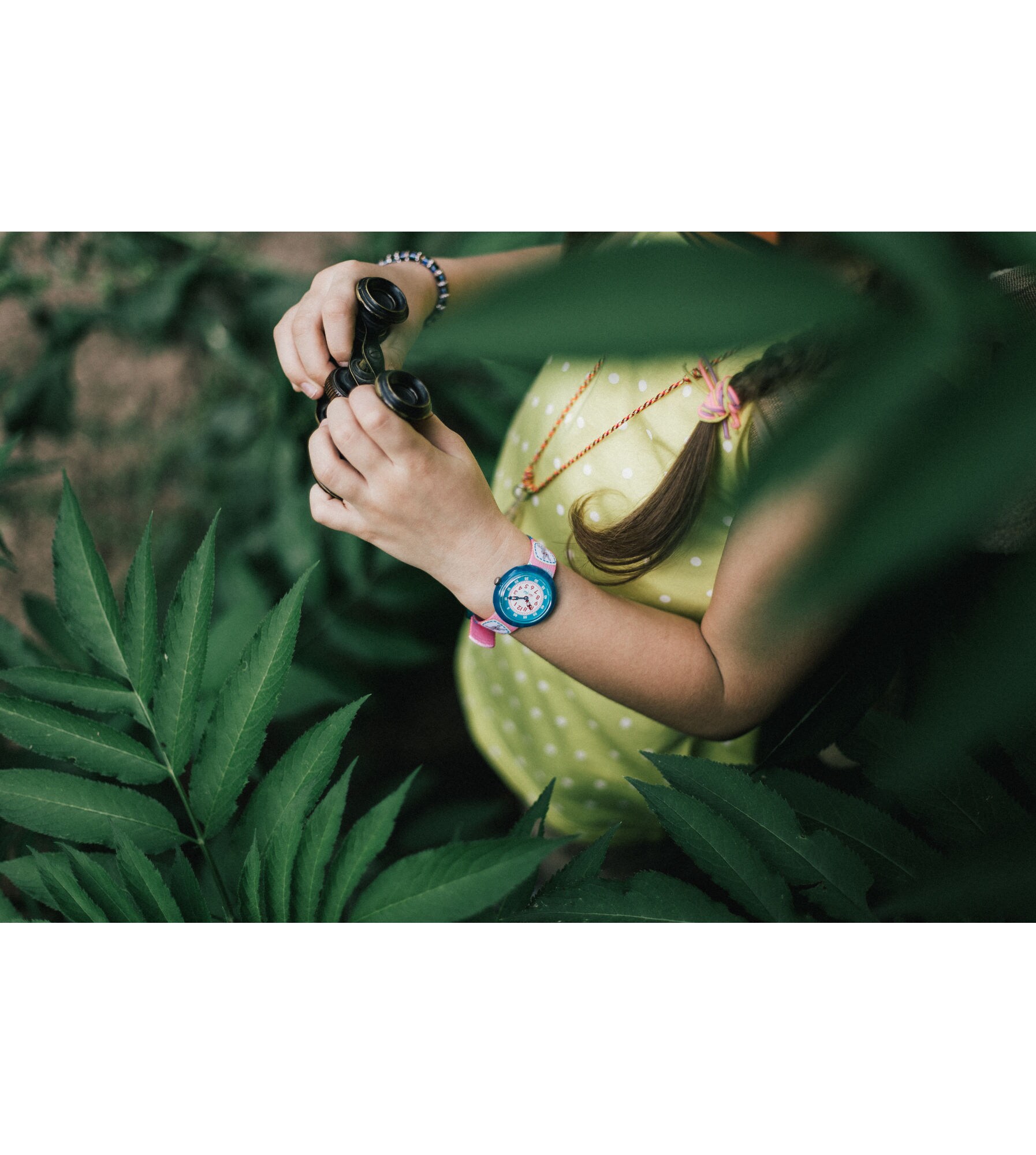 充满乐趣的 Flik Flak 腕表点燃了儿童的想象力,满足了儿童的探险愿望。此款美观的粉色和天蓝色抗震瑞士腕表成为野营生活的典范,饰有兔子、星星、心形、圆锥形帐篷和虫子。色彩标记的表盘帮助儿童轻松分辨时间。