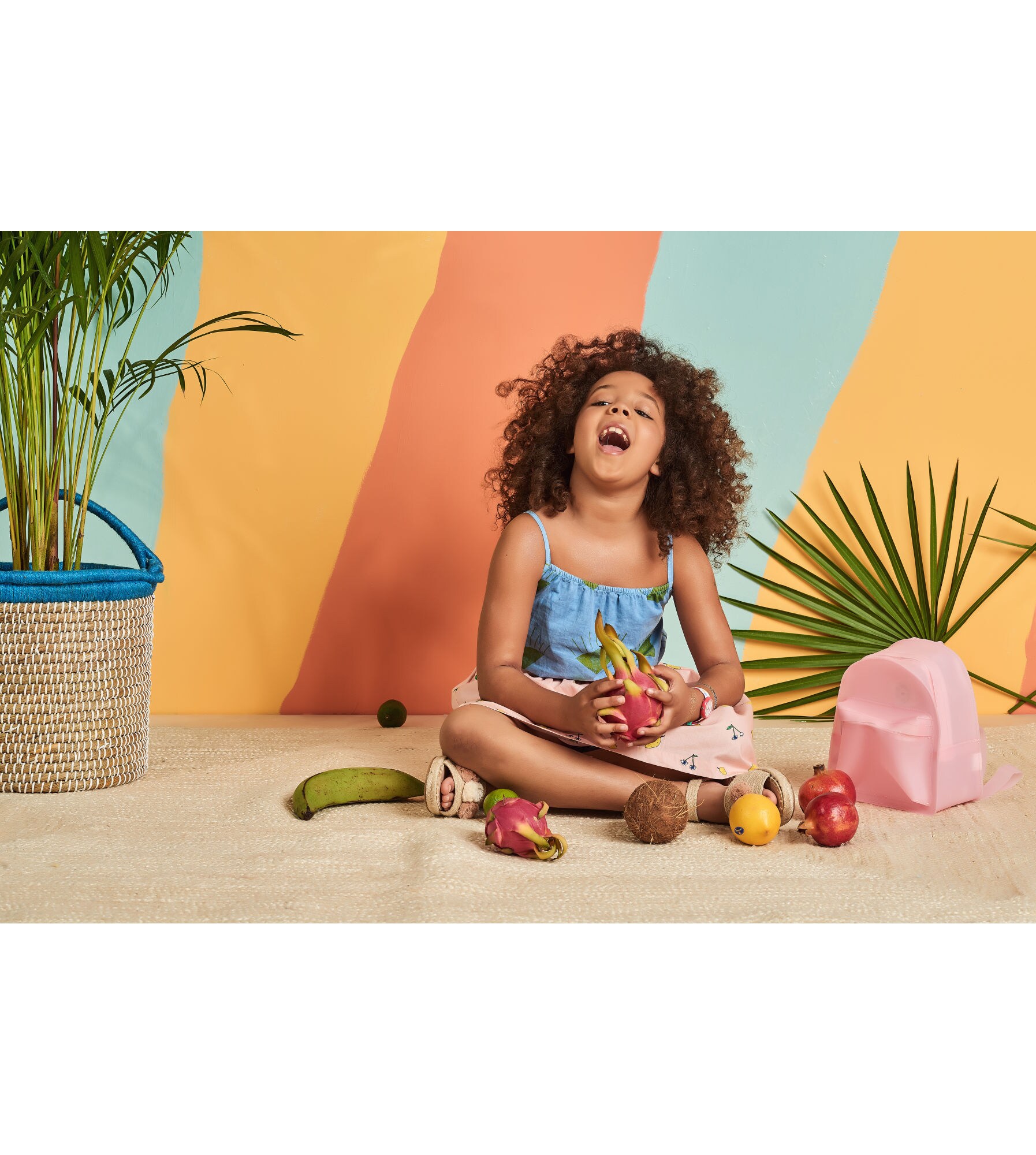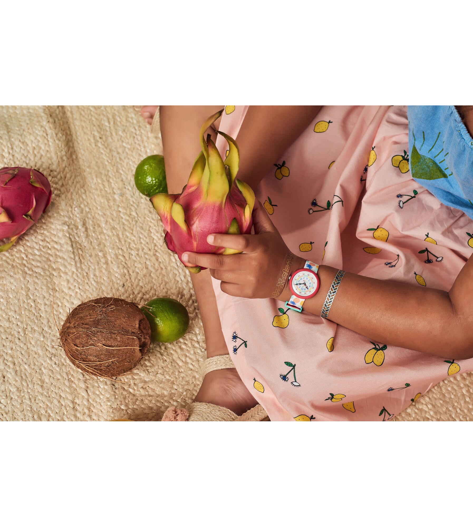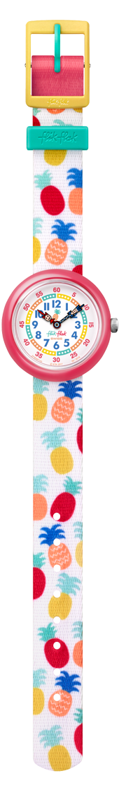 NANANAS 憑其錶帶上的彩色菠蘿矚目登場!明亮輕快的色彩由錶帶延續到錶面上,並與粉紅色塑膠錶殼相互映襯,完美搭配出熱帶風情。錶帶可以經40度水溫清洗。